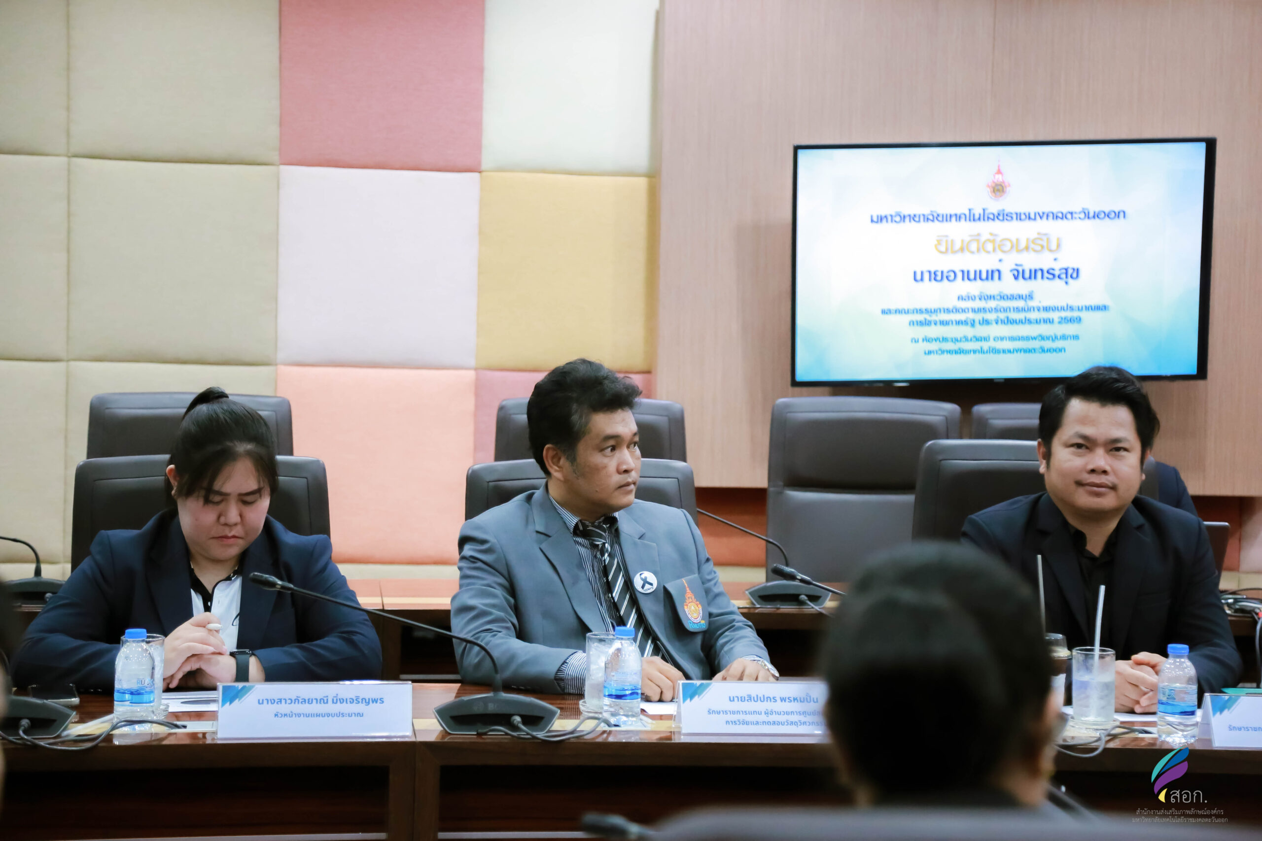 วันพุธที่ 4 มีนาคม 2569 ผู้ช่วยศาสตราจารย์สมศักดิ์ ผลภักดี รองอธิการบดี พร้อมด้วยนางณฐากาญจน์ จันด้วงกุลพัฒน์ ผู้อำนวยการกองคลัง และเจ้าหน้าที่กองคลัง เข้าร่วมการติดตามเร่งรัดการเบิกจ่ายงบประมาณ และการใช้จ่ายภาครัฐ ประจำปีงบประมาณ พ.ศ. 2569 โดยมีนายอานนท์ จันทร์สุข คลังจังหวัดชลบุรี นำทีมคณะกรรมการติดตามเร่งรัดการเบิกจ่ายงบประมาณ และการใช้จ่ายภาครัฐ ประจำปีงบประมาณ พ.ศ. 2569 เพื่อติดตามการใช้จ่ายงบประมาณภาครัฐ ประจำปีงบประมาณ พ.ศ. 2569 และเงินกันไว้เบิกเหลื่อมปีงบประมาณ พ.ศ. 2568 ของหน่วยงานในจังหวัดชลบุรี ให้เป็นไปตามเป้าหมายที่กำหนด ณ ห้องประชุมวันวิสาข์ ชั้น 8 มหาวิทยาลัยเทคโนโลยีราชมงคลตะวันออก เขตพื้นที่บางพระ